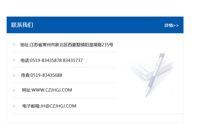 傳真:0519-83435688    郵編:213135    網址:WWW.czjhgj_com.ghdq189.com    電子郵箱:JH@czjhgj_com.ghdq189.com